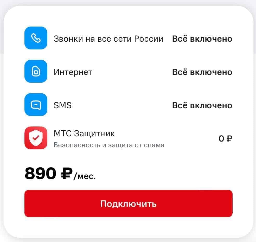 На скриншоте мы видим довольно приятную информацию для абонентов о том, что «Все включено»: и звонки на все сети РФ, и смс-сообщения и мобильный интернет-трафик. И даже сервис защиты от спама «Защитник». Всего за 890 ₽ в месяц. Бежим подключаться.