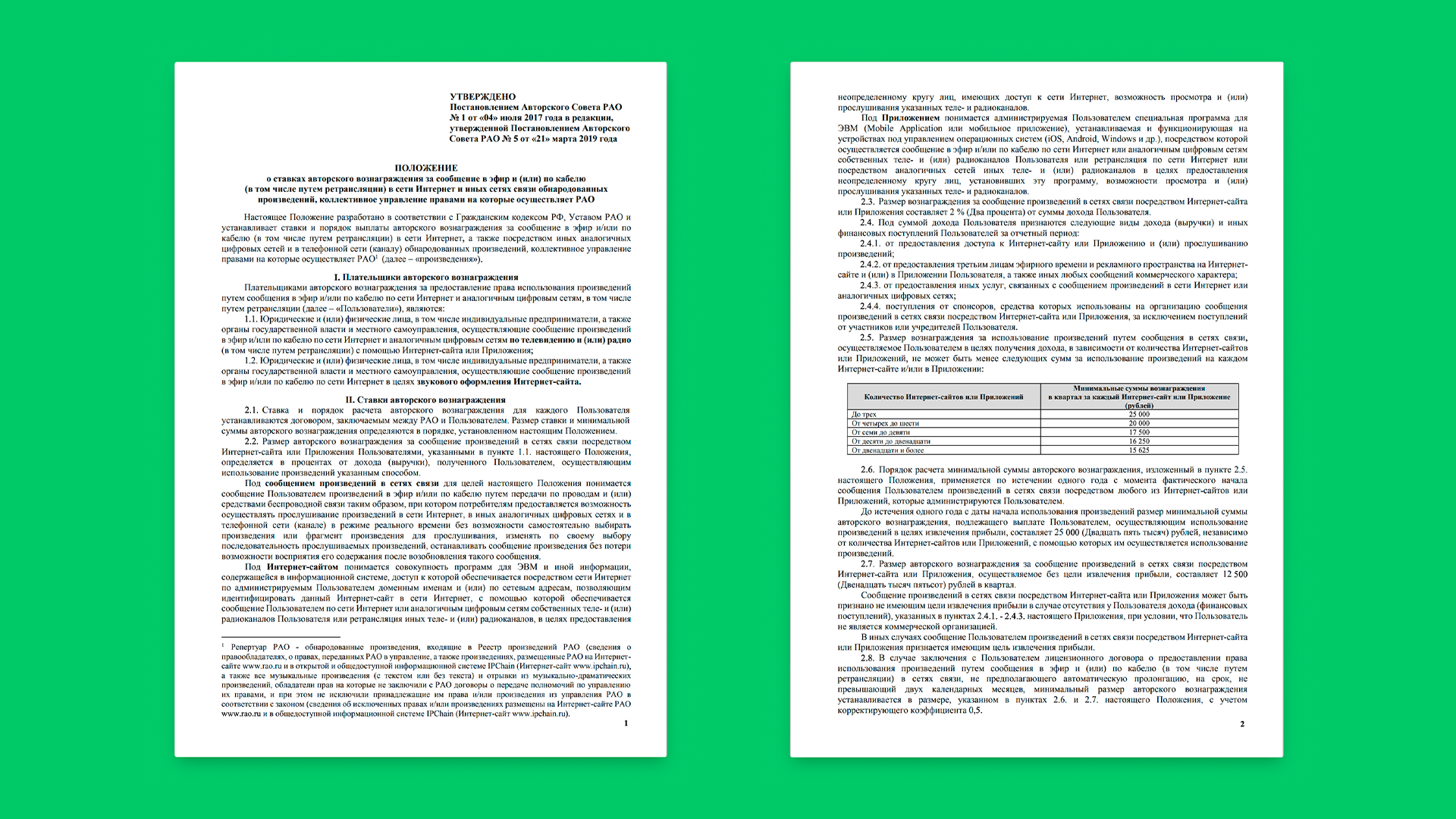 Для российского рынка: есть два «официальных», связанных между собой агентства, представляющие интересы множества обладателей авторских прав всех категорий – Российское авторское общество (РАО) и Всемирная организация интеллектуальной собственности (ВОИС). Авторские отчисления за использование музыкальных произведений можно переводить через них – это наименее хлопотный путь. Необходимо тщательное ежеквартальное заполнение специальных таблиц, в которые вносится более-менее подробная информация о том, какие именно произведения вы используете. РАО и ВОИС, получив эти таблицы, переводят вознаграждение правообладателям. Выгоднее иметь долговременное соглашение с РАО и ВОИС – это дешевле. Шаблон договора с РАО.