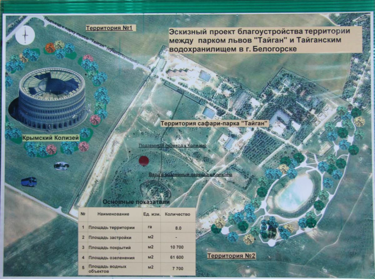 Рядом с «Тайганом» должен был вырасти уникальный во всех отношениях крымский Колизей, в котором могли выступать певцы, сухопутные животные и обитатели морей. По замыслу Колизей должен был вмещать до 10 тысяч зрителей и стать новым крымским чудом света.