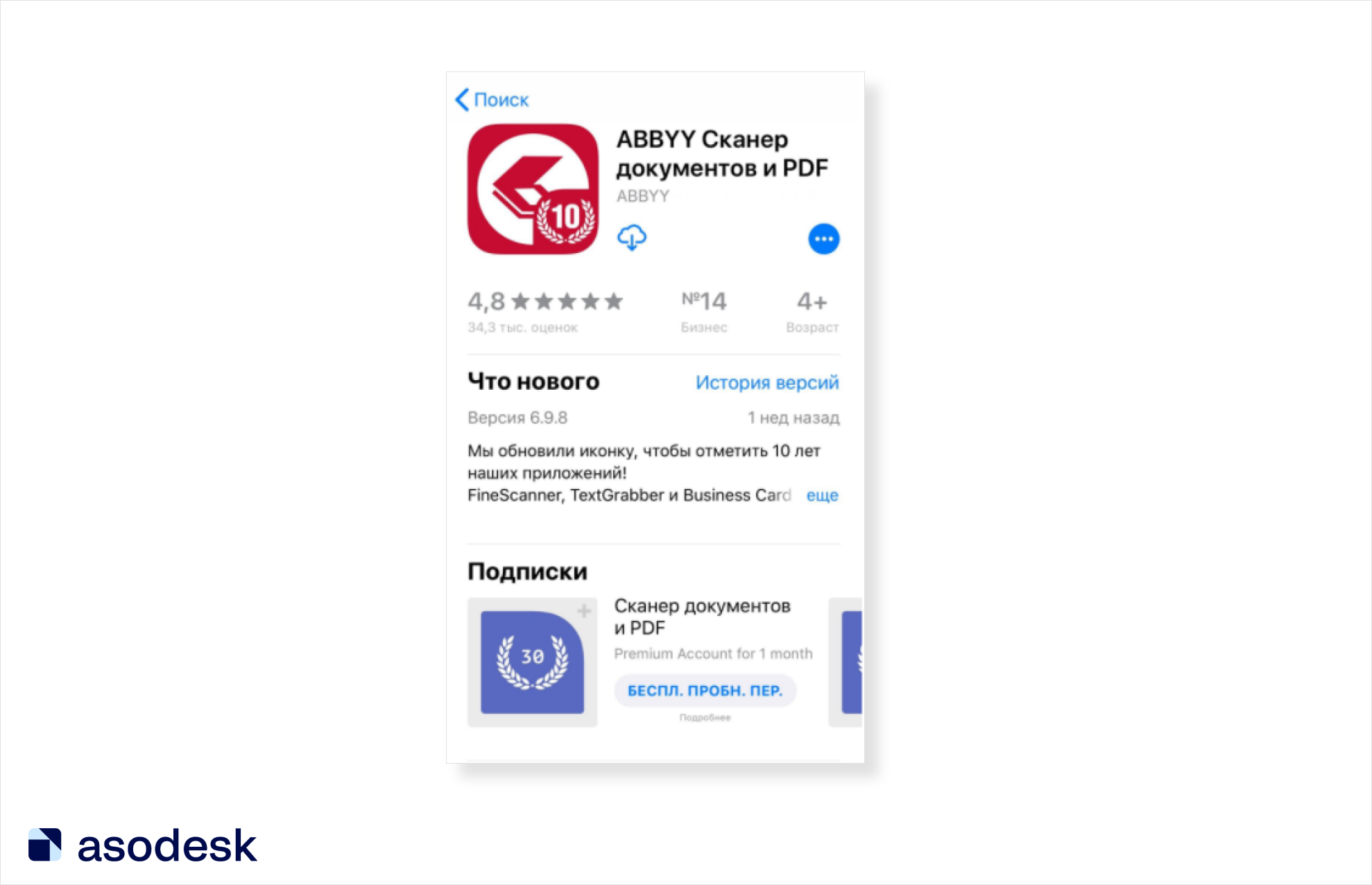 Можно использовать иконку в репутационных целях и рассказать о достижении приложения. Например, бренд ABBYY добавил на иконку цифру 10, чтобы показать, сколько лет исполнилось приложению.