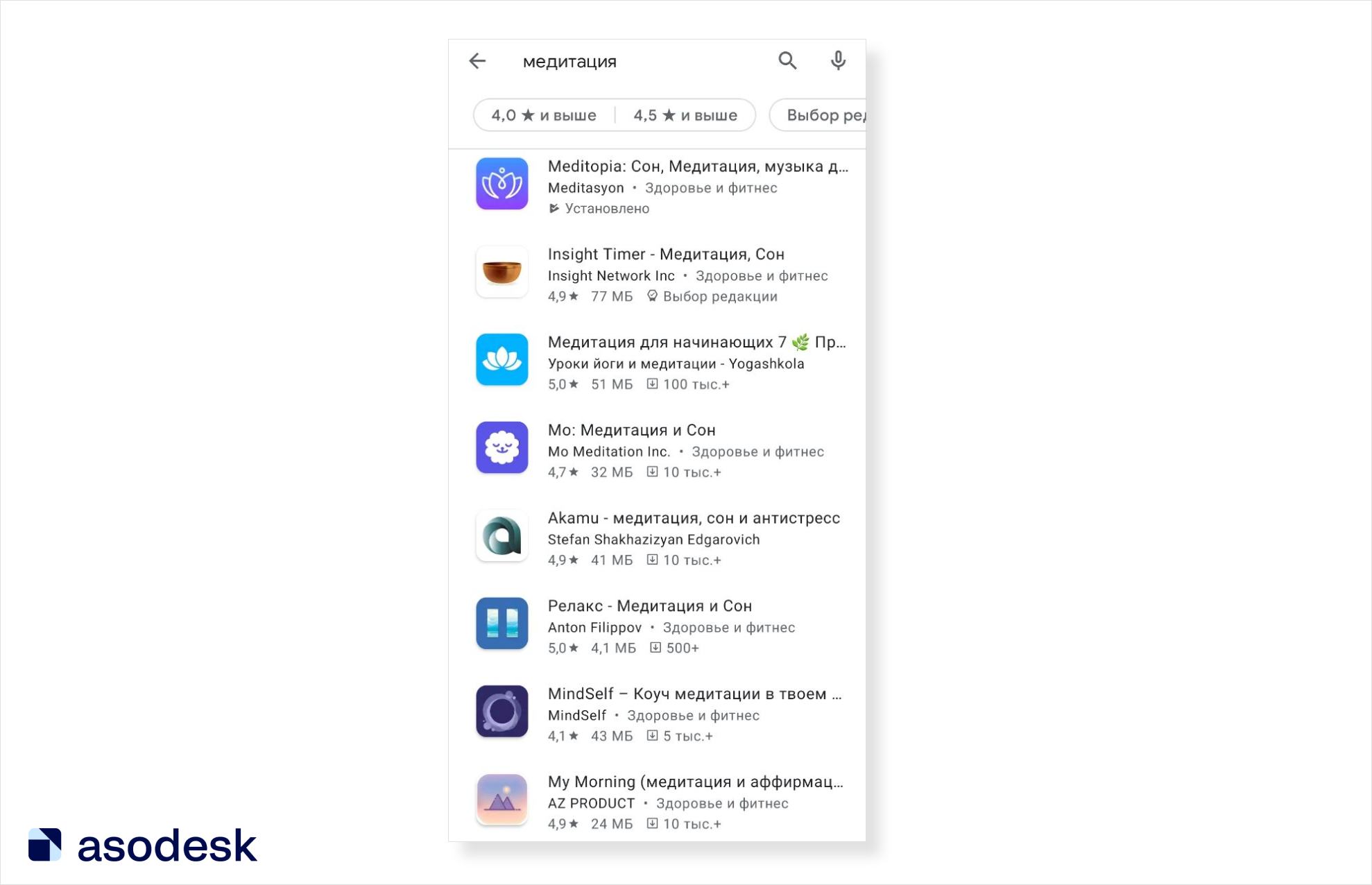Поисковая выдача по запросу «медитация» в Google Play