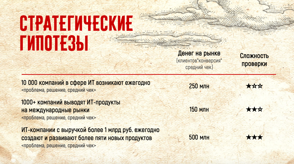 Важно учесть сложность проверки и ответить на вопрос «Как быстро мы сможем подтвердить, что эта выручка вообще существует?». . Проще всего проверить гипотезу в отношении небольших IT-компаний, потому что они быстро принимают решения