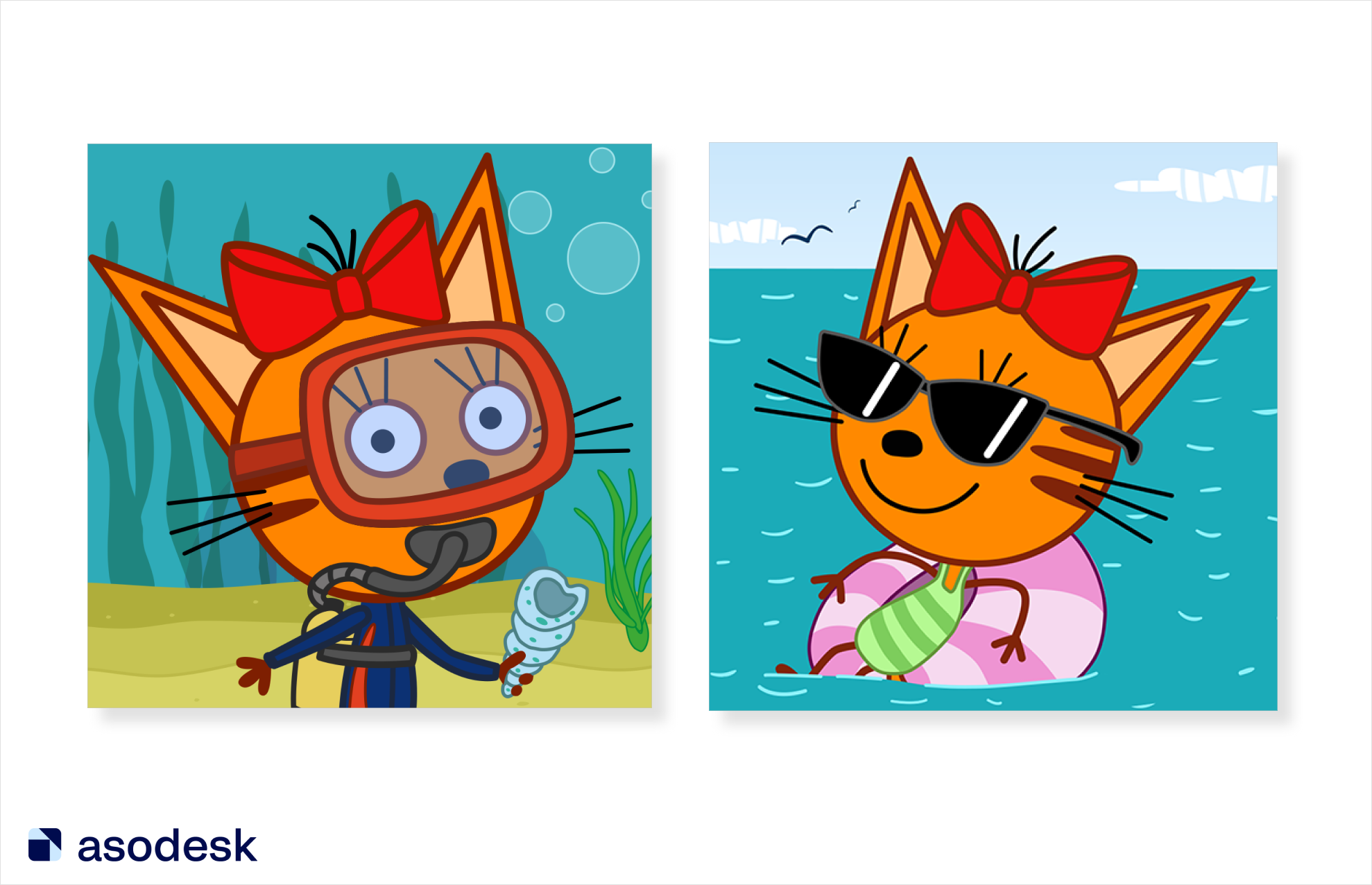 Я выдвинула следующую гипотезу для приложения «Три Кота»: иконка, которая передаёт атмосферу отдыха на море, положительно повлияет на конверсию в летнее время. Поэтому нейтральную иконку с персонажем под водой решила поменять на более яркий вариант.