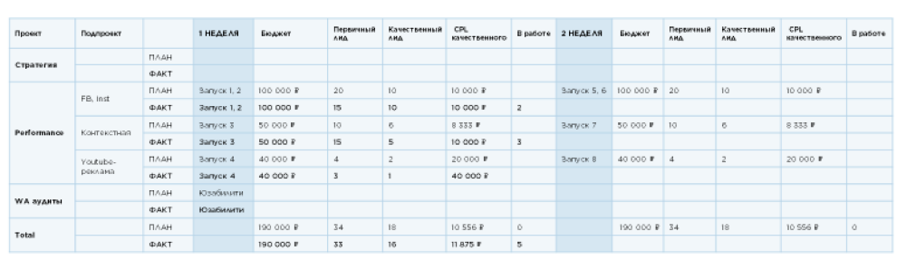 В этом примере на вертикальной оси размещены каналы, на горизонтальной – сроки, бюджет, ожидаемое количество лидов (первичных и качественных) с канала, цена целевого лида.