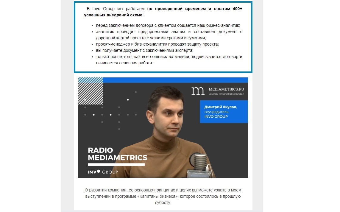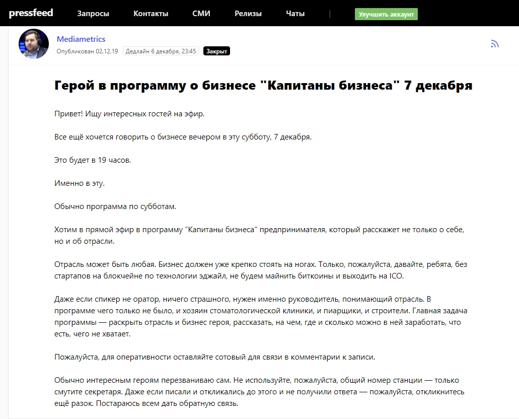 В своих публикациях, интервью, выступлениях мы говорим не только об автоматизации, но и в целом об управлении бизнесом. В декабре 2019 года на сервисе журналистских запросов Pressfeed (специальная платформа для общения редакций СМИ и экспертов/пиарщиков, на которой издания сообщают о том, по какой теме готовится материал и каких спикеров они ищут), который регулярно мониторит наш маркетолог, был запрос от бизнес-радио Mediametrics.