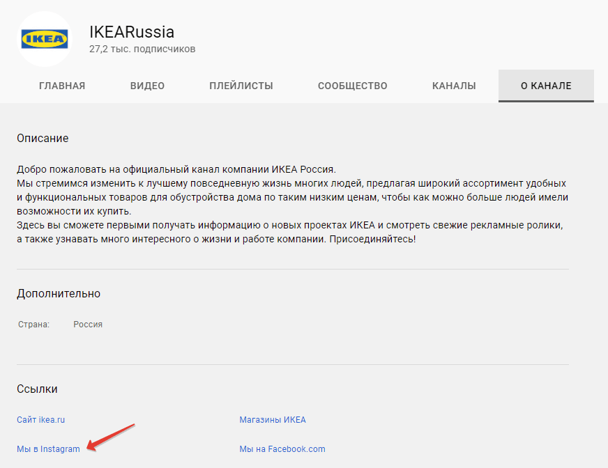 Привлекать трафик в Instagram* из других каналов. Традиционной стала связка YouTube — Instagram*. Начинающие блогеры снимают интересные и полезные видеоролики, попадают в рекомендации YouTube, наращивают аудиторию, а затем приглашают её в свой аккаунт в Instagram* и получают органических подписчиков. Обе площадки ориентированы на визуальный контент, поэтому подписчики из YouTube охотно подпишутся на Instagram*, если размещать там дополнительные материалы: например, кадры со съёмок видео или сториз в режиме реального времени. Также можно разграничить площадки по содержанию контента и этапам маркетинговой воронки. Например, IKEA Russia размещает на YouTube интервью и репортажи о своих социальных проектах, публикует handmade-лайфхаки. Такой контент вызывает доверие у аудитории, позволяет познакомиться с компанией. В разделе о канале IKEA Russia предлагает перейти в Instagram-аккаунт, который входит в ТОП-10 самых популярных страниц брендов (согласно рейтингу сервиса подбора инфлюенсеров ADinBLOG). Там они размещают информацию о продуктах: фотографии новинок, интерьеры, композиции из товаров IKEA.