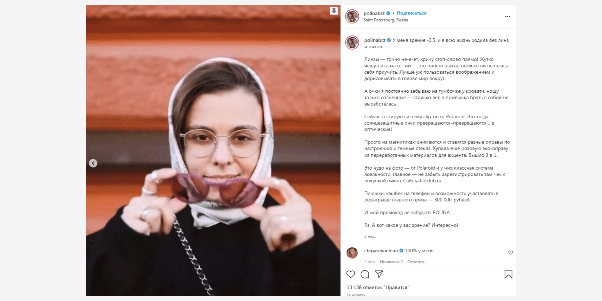 Пример рекламы очков Polaroid у блогера из Санкт-Петербурга Полины Бржезинской