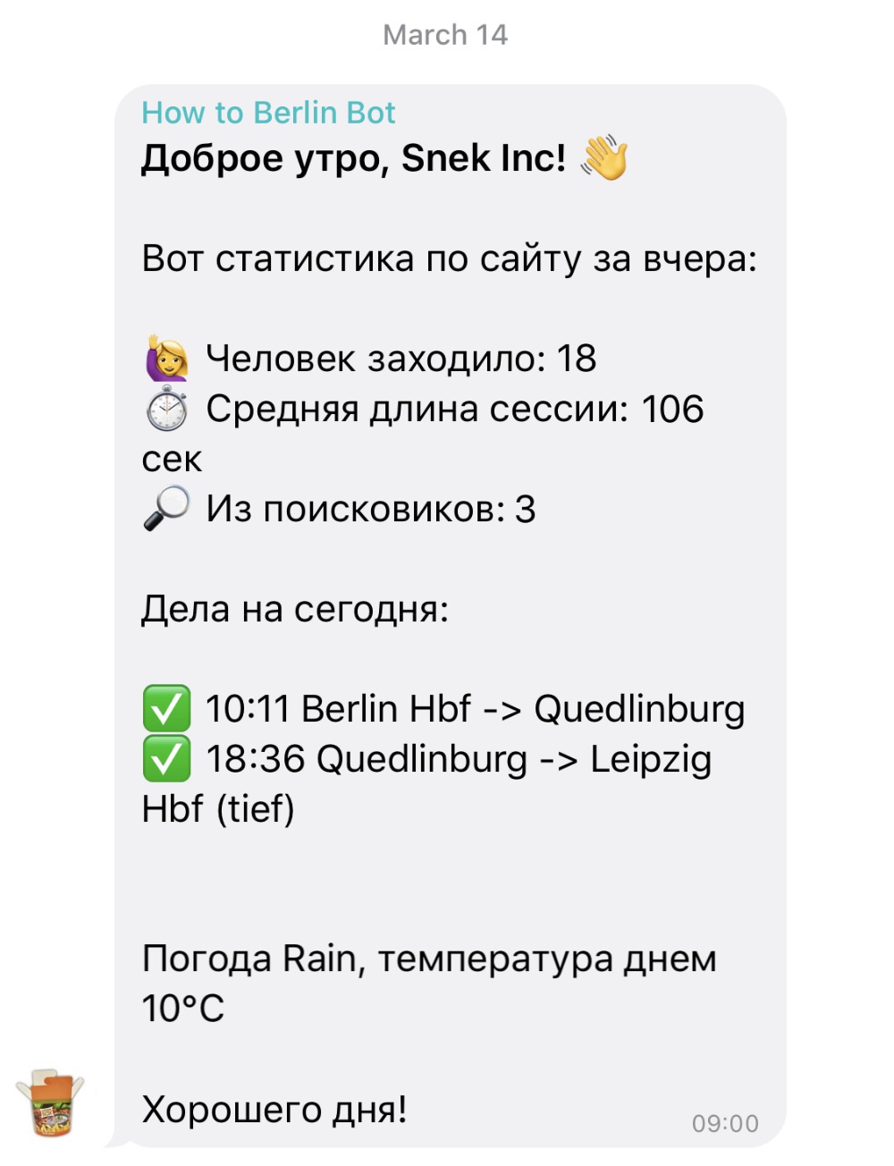 Вот бот для Лены, который пишет ей каждое утро в 9:00, кроме воскресенья (в Германии это священный выходной даже для ботов).