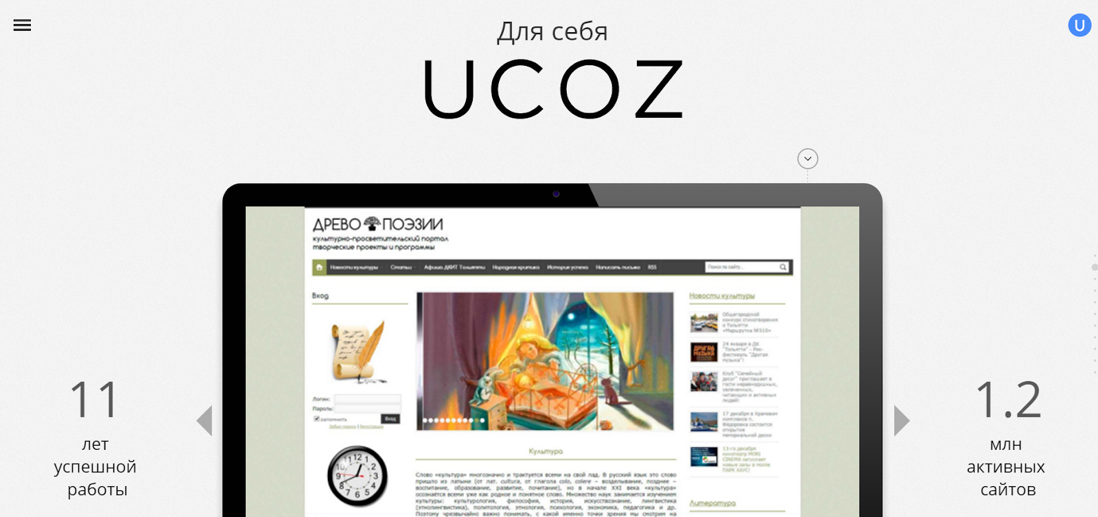 Модульный конструктор, успешно работающий с 2005 года. Один из лидеров рынка конструкторов сайтов, являющийся эталоном для других сервисов. Благодаря модульности достигается универсальность uCoz: на нем получится создать сайт любого типа, результат зависит только от умений веб-мастера.