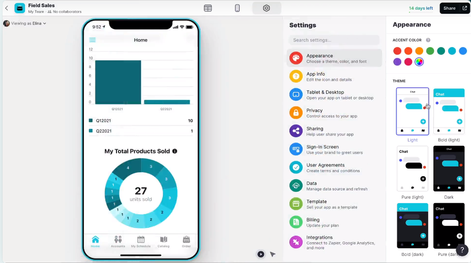 Платформу часто выбирают из-за простого интерфейса и коллекции стильных шаблонов. Выбрать дизайн можно из более чем 25 готовых компонентов. Важная особенность платформы — разработанные в ней продукты можно публиковать в AppStore и Google Play (в платном тарифе).