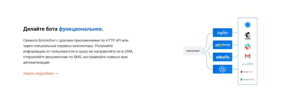 Платформа позволяет создавать не только простые, но и довольно сложные продукты, если пользователь технически подкован. Возможна интеграция с Twillo, Telegram, Coupler и сервисами Zapier.
