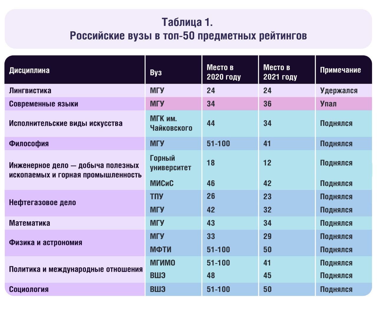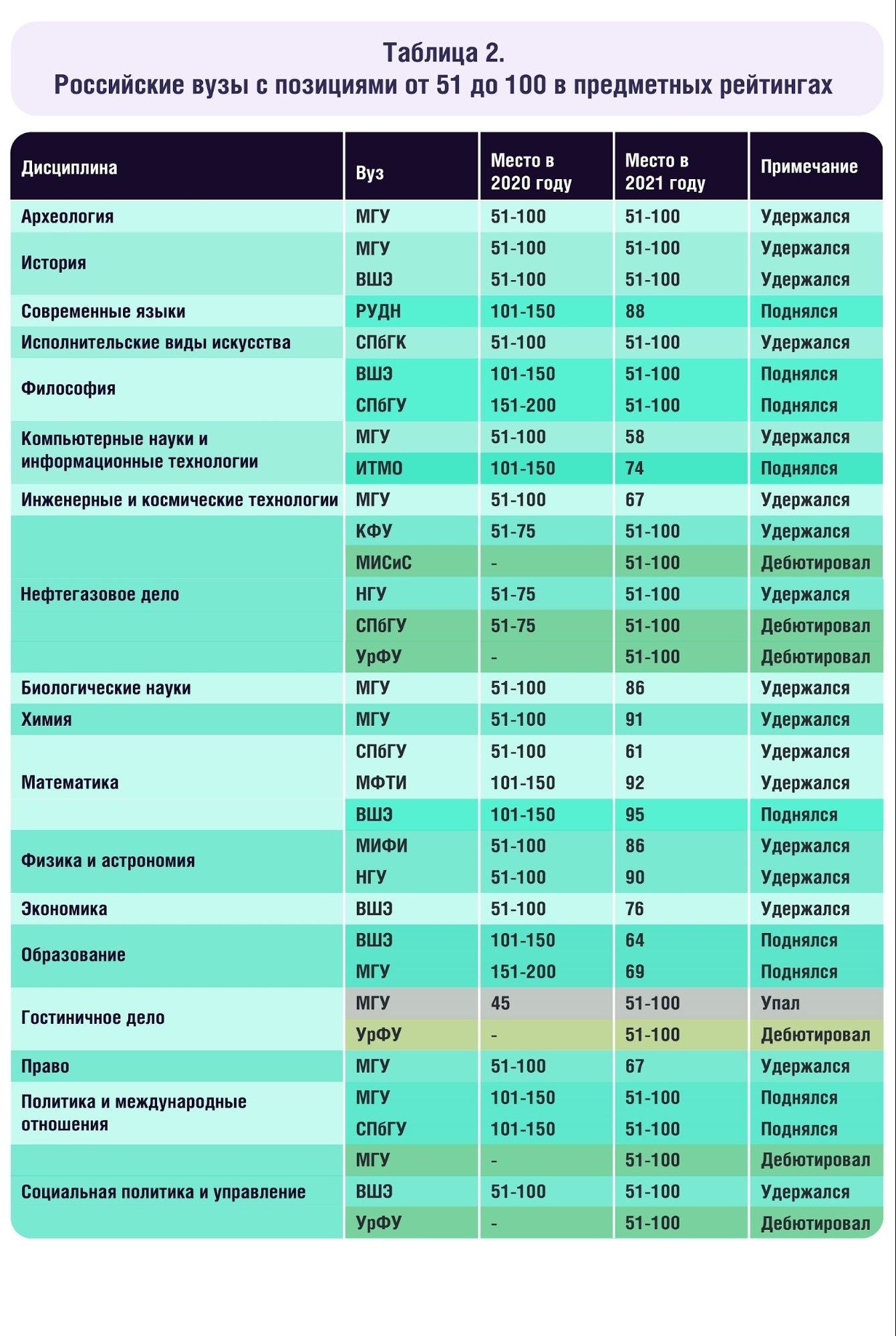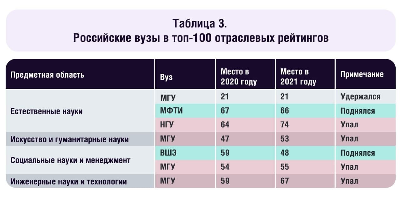Больше всего российских вузов представлено в отраслевом рейтинге по естественным наукам — 15. Меньше всего — в рейтинге по наукам о жизни и медицине, туда вошли всего два вуза: МГУ и СПбГУ. В предметных рейтингах больше всего российских вузов отметилось в физике и астрономии, математике, компьютерных науках и информационных технологиях.