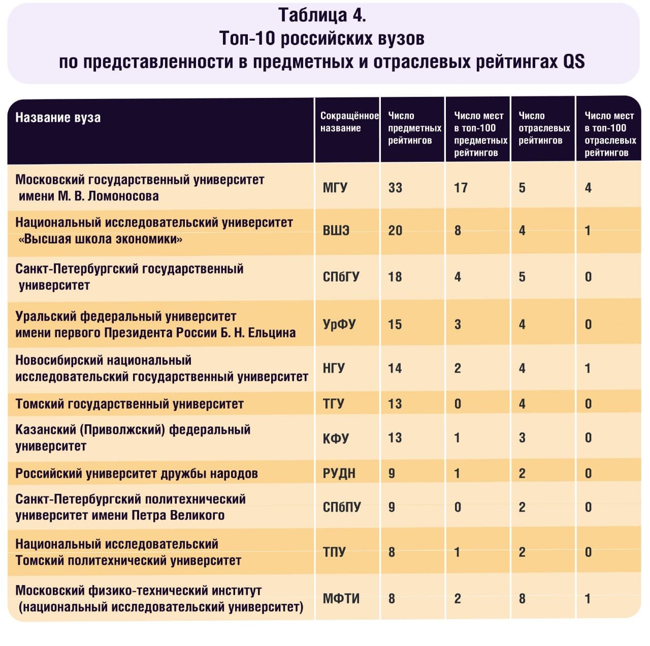 Всего в предметные и отраслевые рейтинги QS в этом году попали 40 российских вузов — для сравнения, год назад их было 36. По словам регионального директора QS Сергея Христолюбова, Россия вошла в топ-10 стран по числу университетов, включённых в рейтинги.