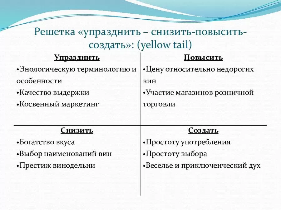 Проще говоря, решетка «упразднить-снизить-повысить-создать» представляет собой конкретные шаги в четырех направлениях для осуществления стратегии голубого океана. Данное руководство предоставит возможность изменить ценности, чтобы дать потребителю необходимый продукт.