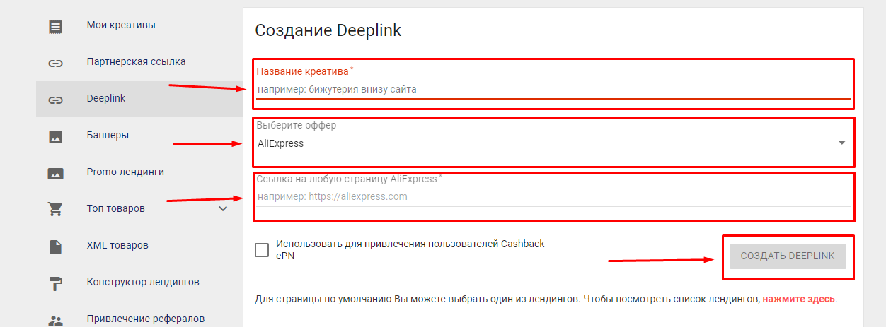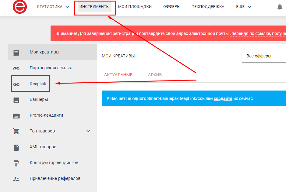 - создать креатив – ссылку, баннер, диплинк, лендинг;