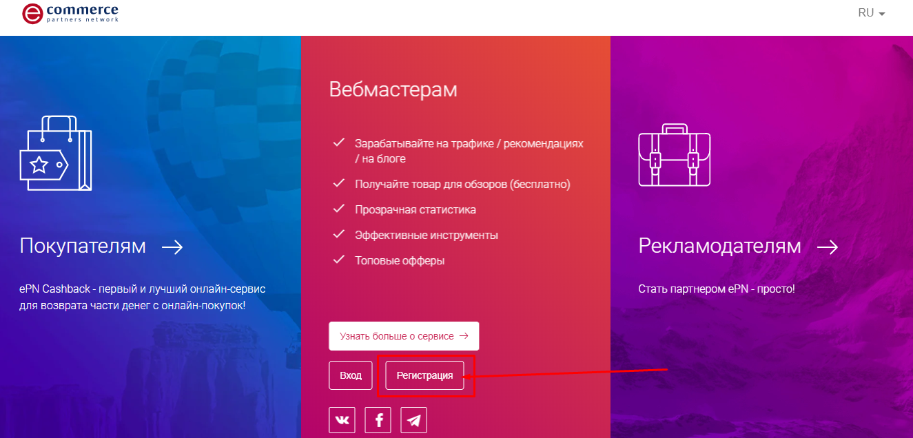Выгодное сотрудничество начинается с регистрации. Открываем главную страницу официального сайта ePN, наводим курсор на раздел “Вебмастерам” и кликаем на кнопку “Регистрация”.