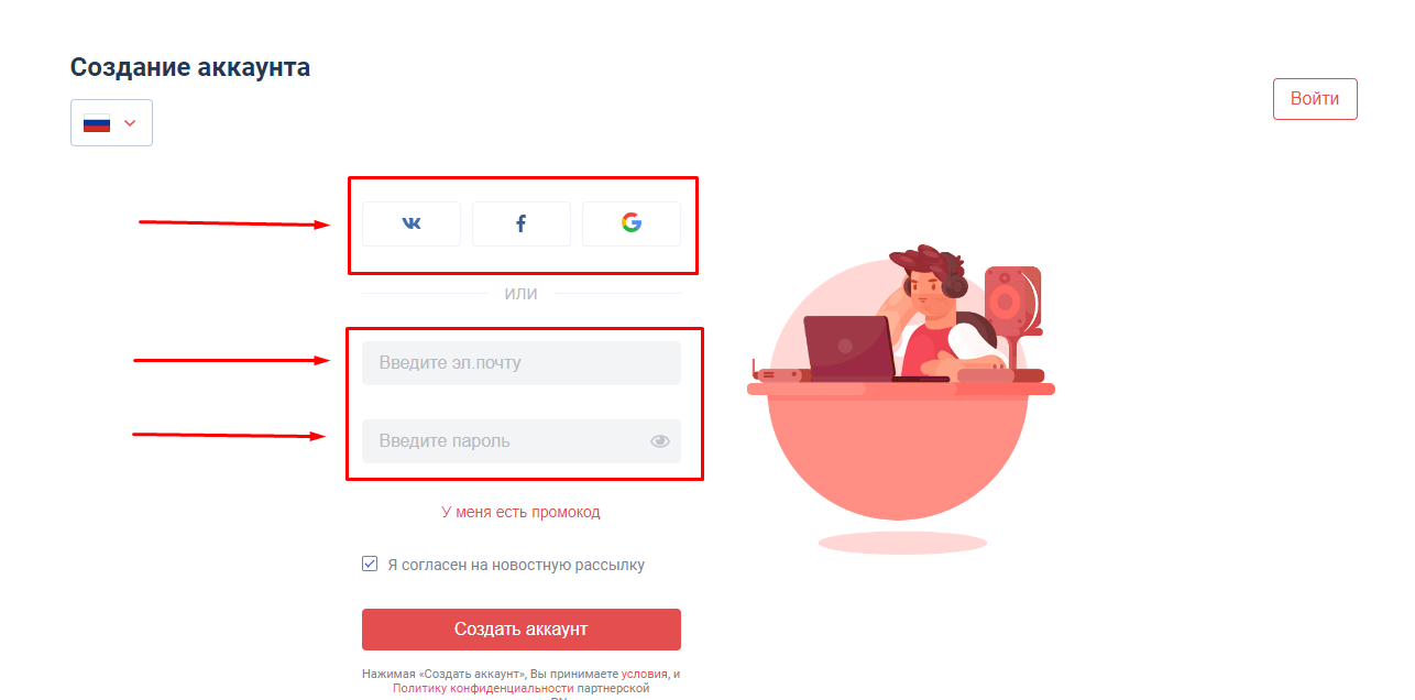 В открывшемся окне выбираем удобный способ регистрации — по почте или через аккаунты VK, Facebook и Google. Нажимаем кнопку «Создать аккаунт».