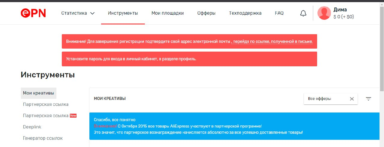 Мы уже попали в команду ePN. У нас появился личный кабинет и куча возможностей.