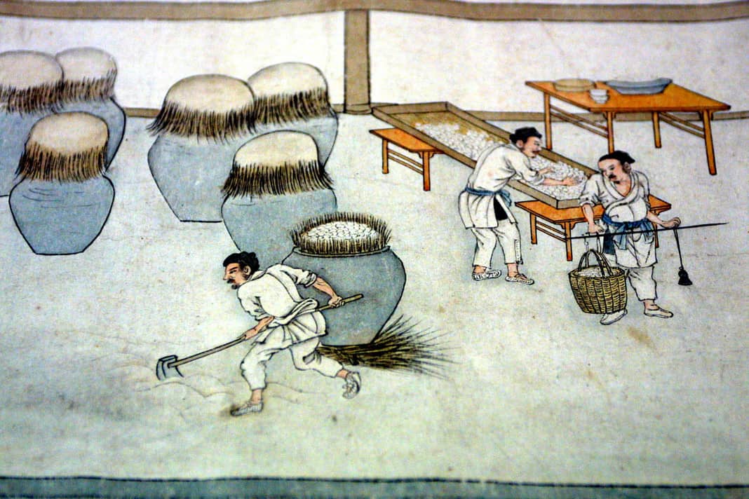 Пеньку, кору тутового дерева, ткань и отслужившие срок рыбацкие сети кипятили до тех пор, пока масса не превращалась в пульпу – рыхлую волокнистую массу. Дальше тщательно перетирали до однородной массы, полученную суспензию разбавляли водой. В прямоугольном сите из тростника встряхивали волокнистую массу до образования тонкого слоя. Вода стекала, содержимое оборачивали на гладкую поверхность и, прижав прессом, оставляли для затвердевания. Окрепшие под гнетом листы бумаги сушили на воздухе. Лист получался прочным и ровным, достаточно светлым.