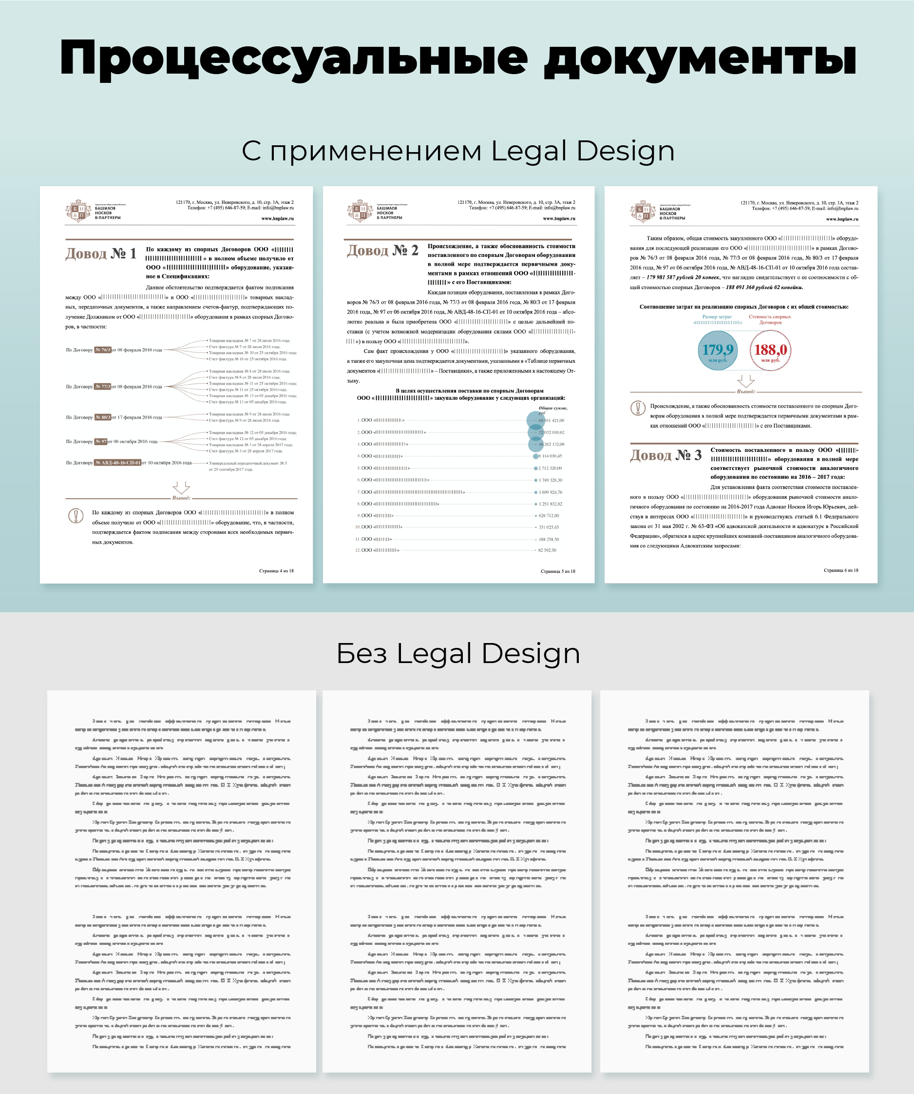 Мы в бюро уделяем большое внимание подготовке документов. Используем визуализацию в поддержку доводов, выделяем в тексте ключевые факты и аргументы, к которым хотим привлечь внимание судьи