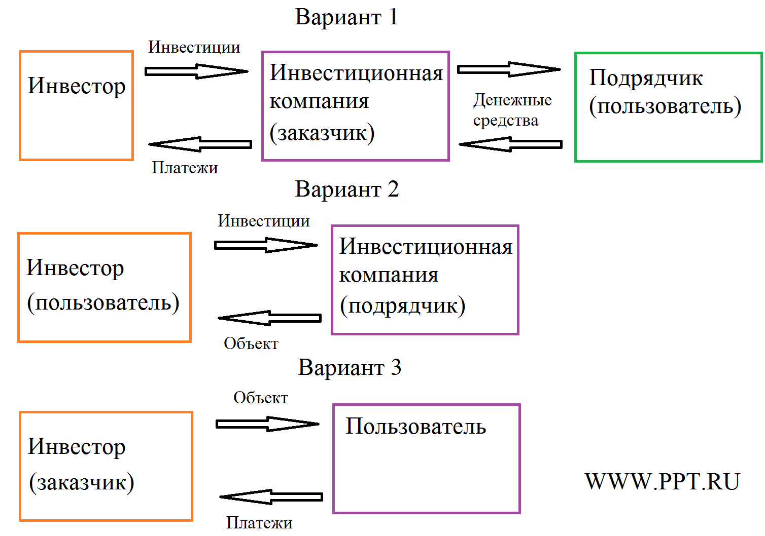 - использование в субъектном составе множественности связей (инвестор заключает договор с инвестиционной компанией, которая нанимает подрядчика для строительства объекта. После того как объект введен в эксплуатацию, он будет находиться в пользовании компании, за что она станет выплачивать денежные средства инвестору).