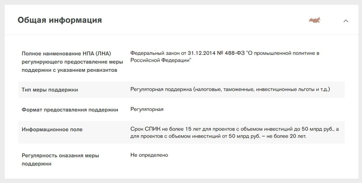 Специальное инвестиционное соглашение с администрацией действует от 4,5 месяцев до 20 лет. Срок варьируется в зависимости от целей и задач специального проекта инвестирования.