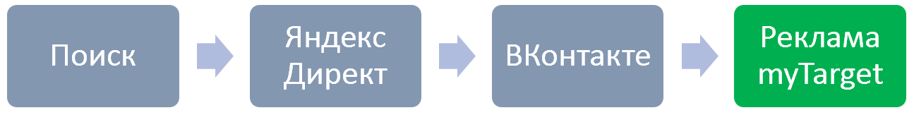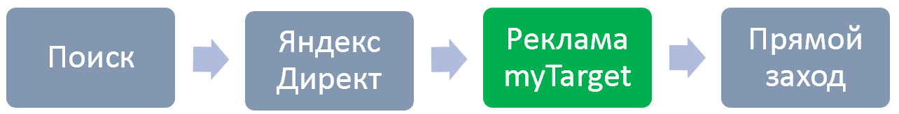 Другой пример. Пользователь, опять-таки, зашел на сайт несколько раз. В последний раз — по рекламе myTarget. Он перешел по объявлению, решил сделать заказ, но не сделал, а сохранил себе ссылку и ушел на час.