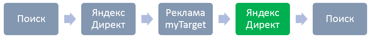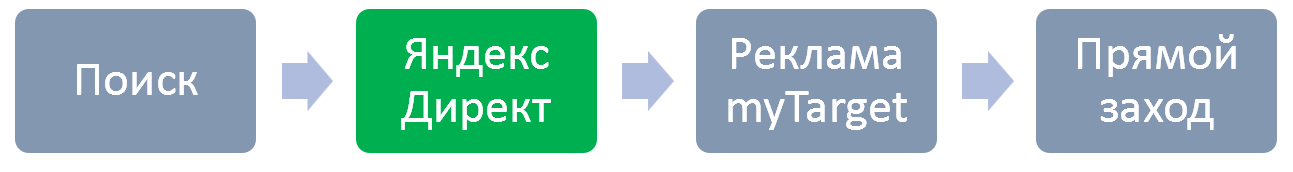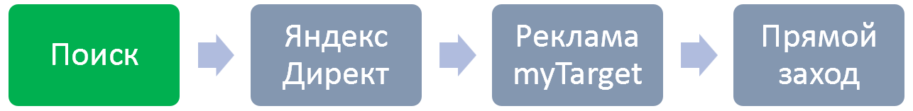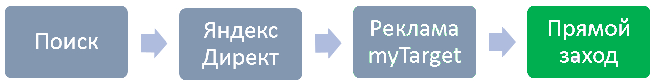 Пример. Вернемся к последнему примеру, где пользователь пришел на сайт по рекламе myTarget, но отвлекся и потом совершил прямой заход. В случае с моделью «Последний значимый переход» система среагирует корректно и посчитает ценным заход с рекламы.