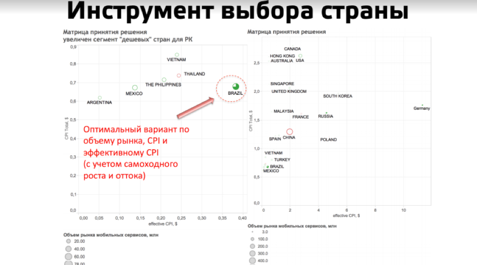 После анализа открытых данных мы построили матрицу принятия решений и выяснили, что оптимальный вариант по объему рынка и эффективному CPI — это Бразилия. Мессенджер вышел на бразильский рынок, и там действительно случился бурный рост. Этому кейсу уже 4–5 лет.