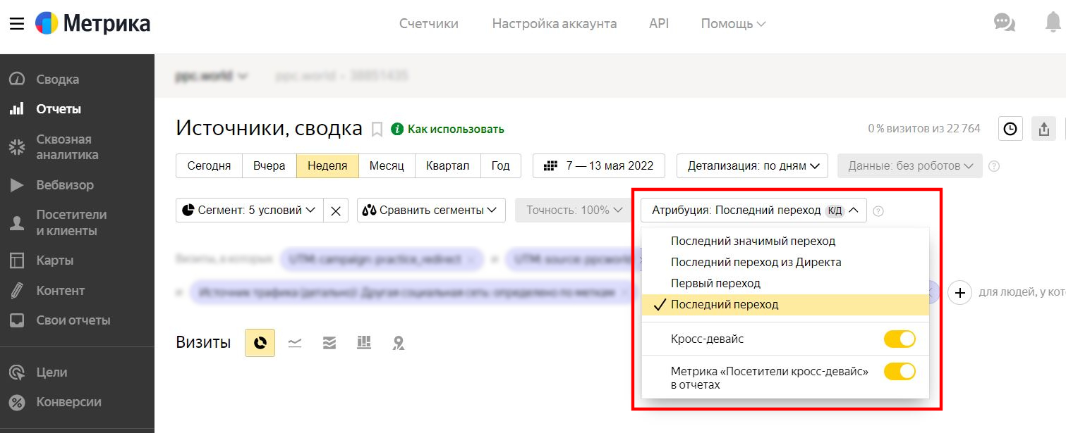 Зато модель хорошо подходит для технического аудита сайта. Бывает, что на сайте есть страницы без счетчика Яндекс Метрики, и нужно их найти. Тогда мы поставим модель атрибуции «Последний переход» и проанализируем все внутренние переходы. Если мы переходим со страницы, на которой нет счетчика Яндекс Метрики, на страницу со счетчиком, засчитается новый визит с источником «Внутренний переход».