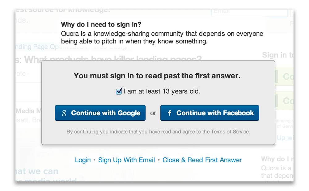 Что делать, если вы хотите поднять конверсию в регистрацию на этих страницах с подробностями, например, на лендинге отдельного инструмента? Конечно, вы можете выбрать рост за счет закрытия контента до регистрации, как это делает Quora, но можно это сделать за счет улучшения UX: