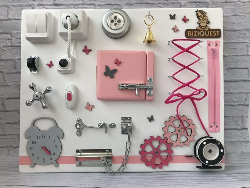 Бизиборд (busy board) – современная развивающая игрушка для малышей, которая может занять ребенка на долгое время. Это специальная доска с закрепленными на ней элементами. В игре с бизибордом у ребенка формируются различные навыки, способность логически мыслить, выстраивать причинно-следственные связи, развивается мелкая моторика. В результате взаимодействия с предметами, зафиксированными на доске, возникают новые нейронные связи в мозге, ускоряется развитие памяти, речевых центров.