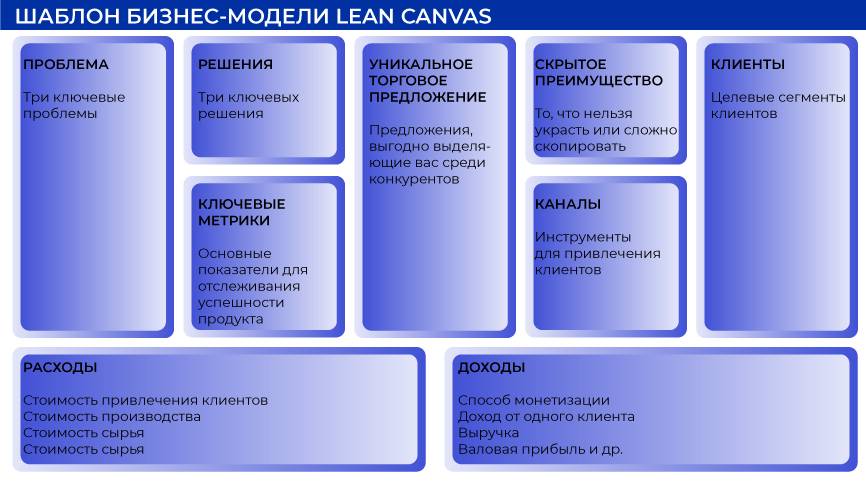 Это упрощенная модель Остервальдера, обычно используемая стартап-проектами. Отличие — наличие в шаблоне дополнительных или видоизмененных блоков: