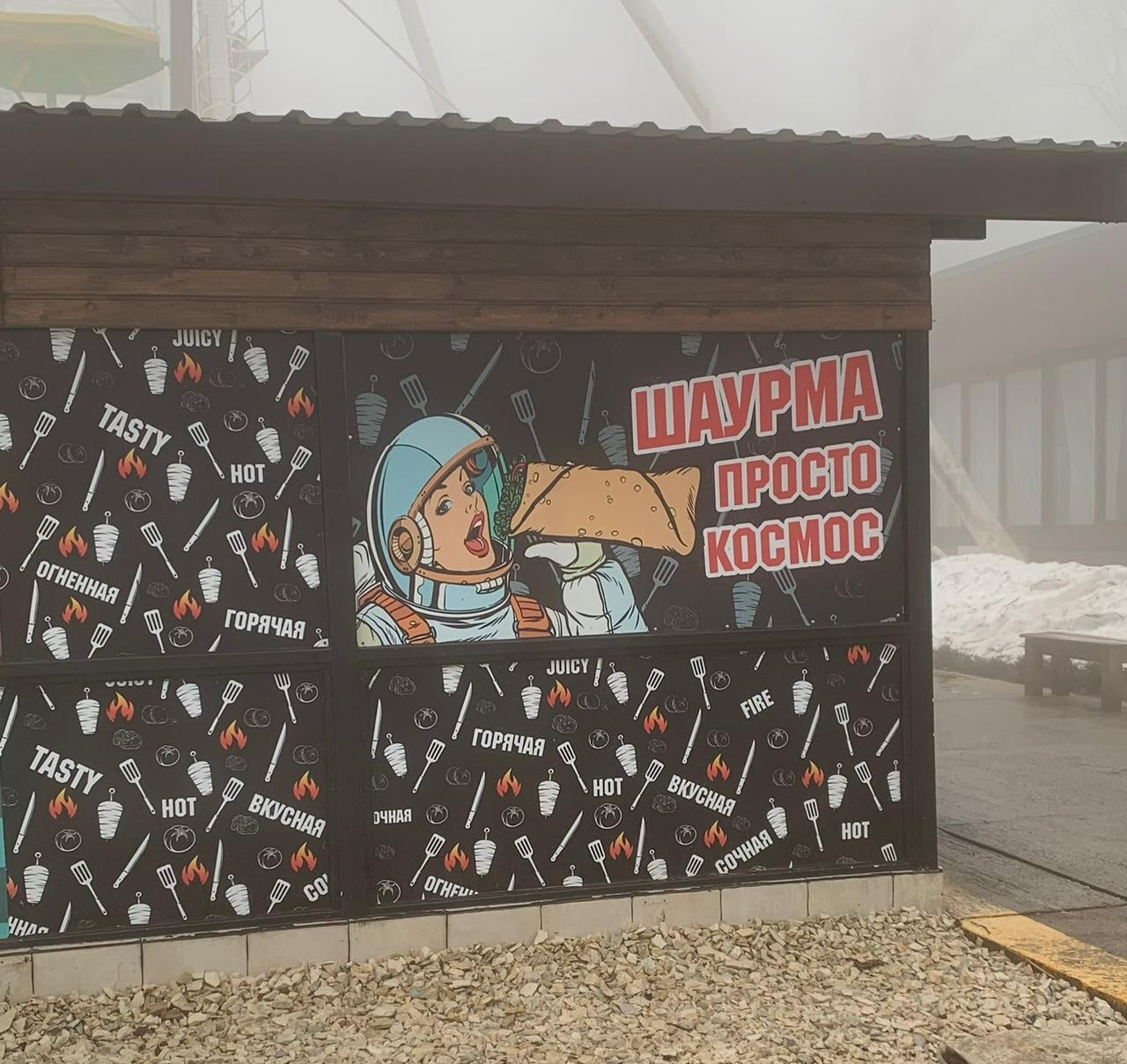 Если больше на визуальном/коммуникационном — аккуратнее с дизайнерскими и вординговыми клише. Если на уровне смысла — помните о балансе содержания и формы. Например, если вы шаурменная или пивной бар, то космос вряд ли про вас. Иначе могут получиться такие шедевры: