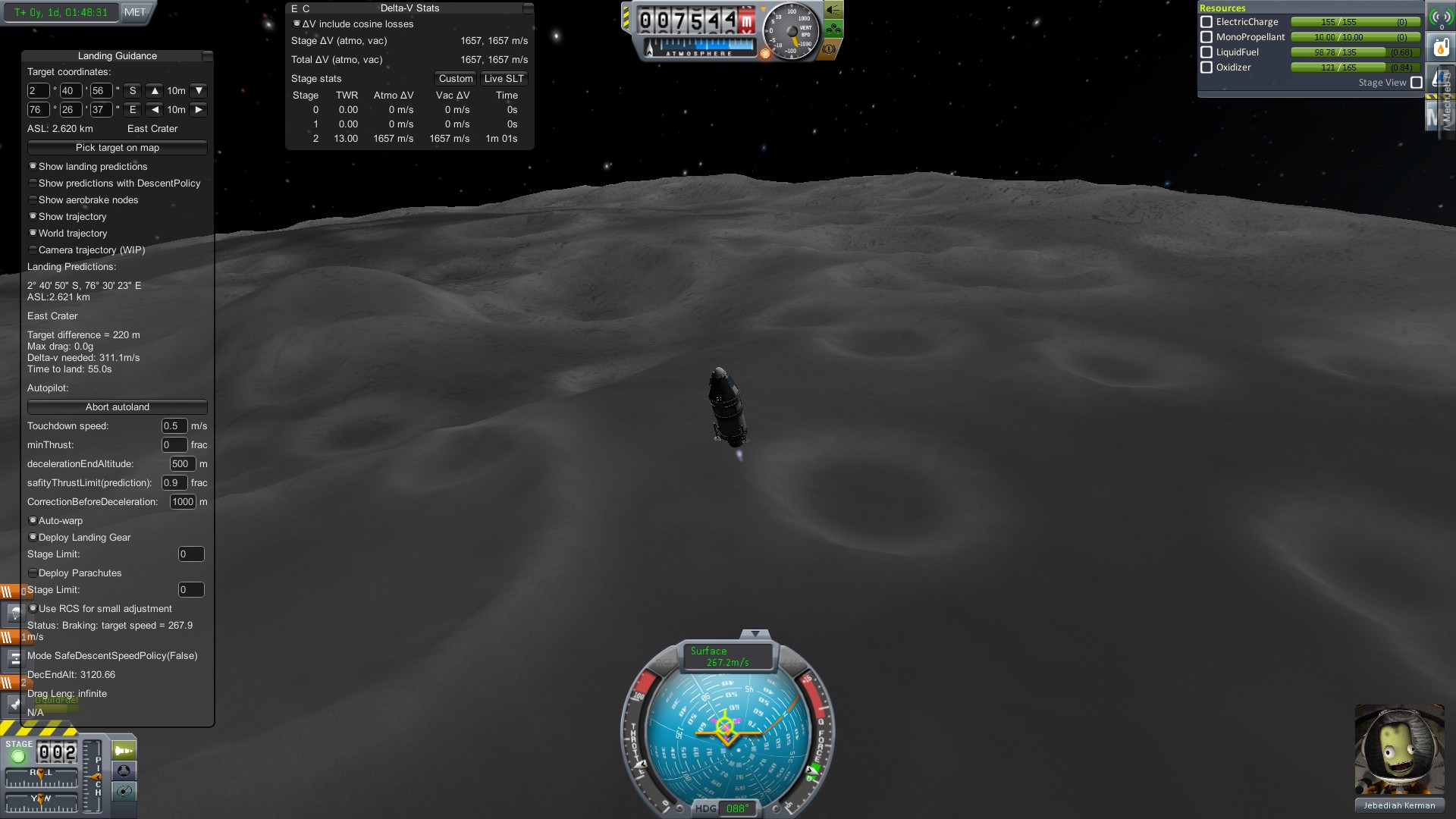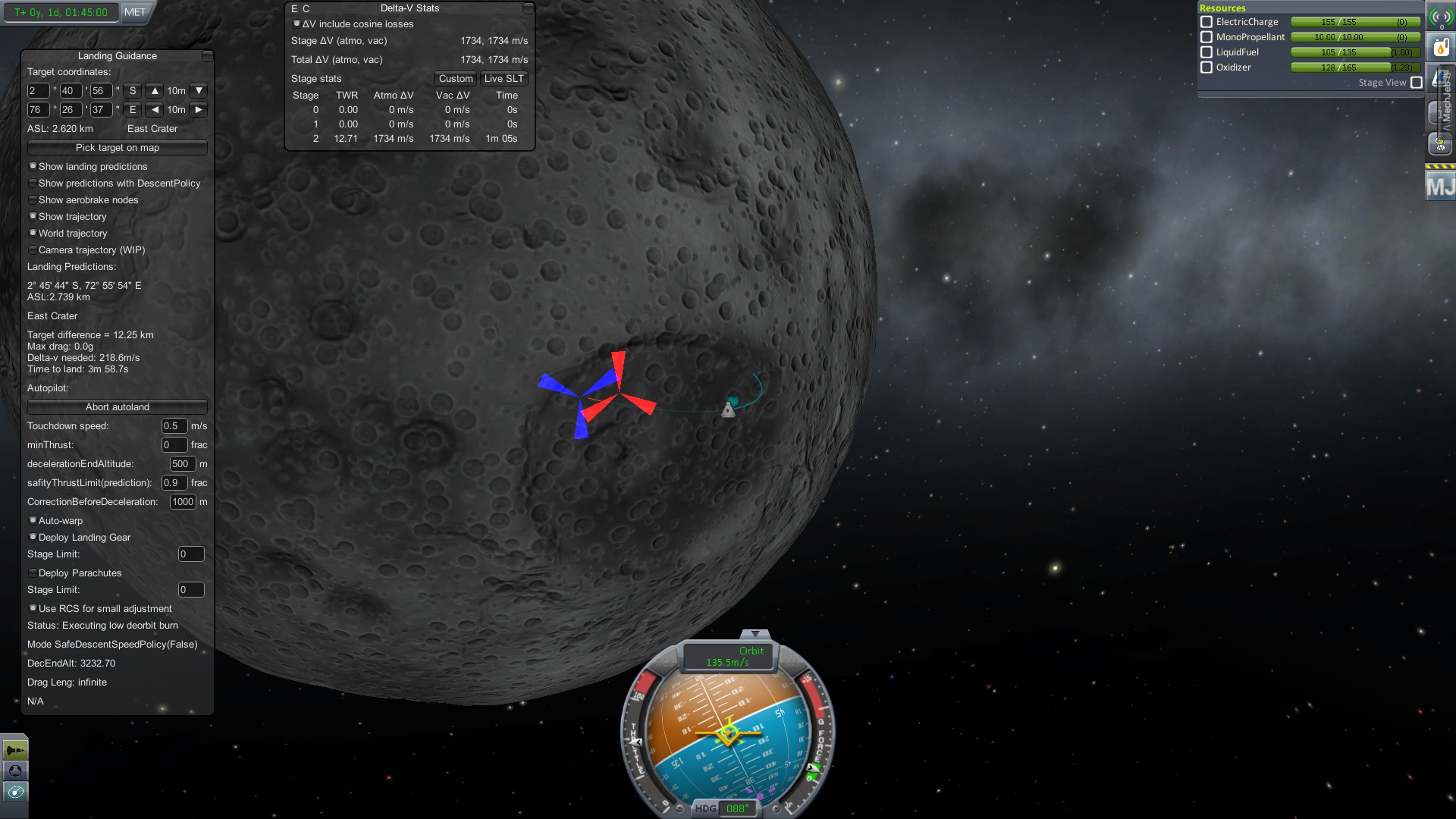 Итак, выбираем понравившуюся точку на Муне, сохраняемся и жмем “Land at Target”. Автоматика начнет выполнять маневры БЕЗ планирования, иногда ей приходится совершить пару витков перед тем как начать торможение.