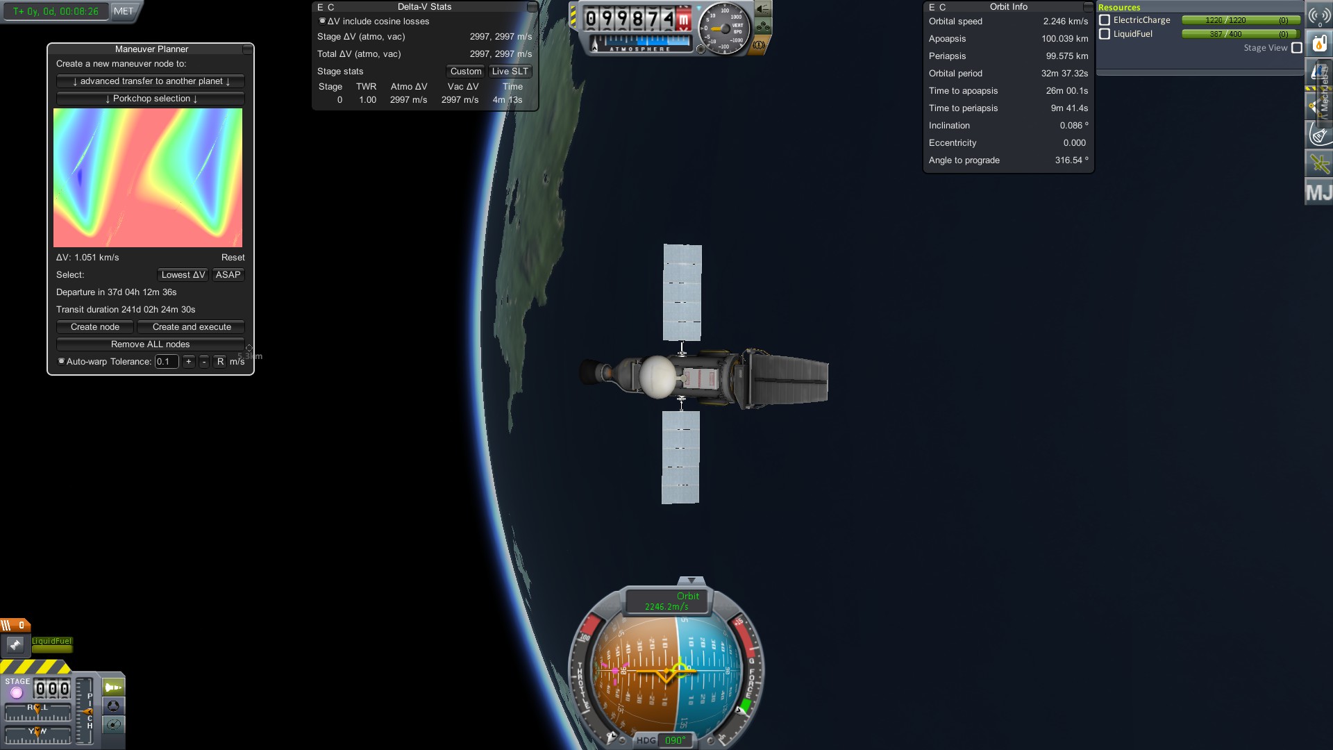 Вывожу аппарат на орбиту в 100 км. В меню MechJeb’а выбираю опцию “Maneuver Planner”, в открывшемся окне выбираем маневр “Advanced Transfer to Another Planet”.