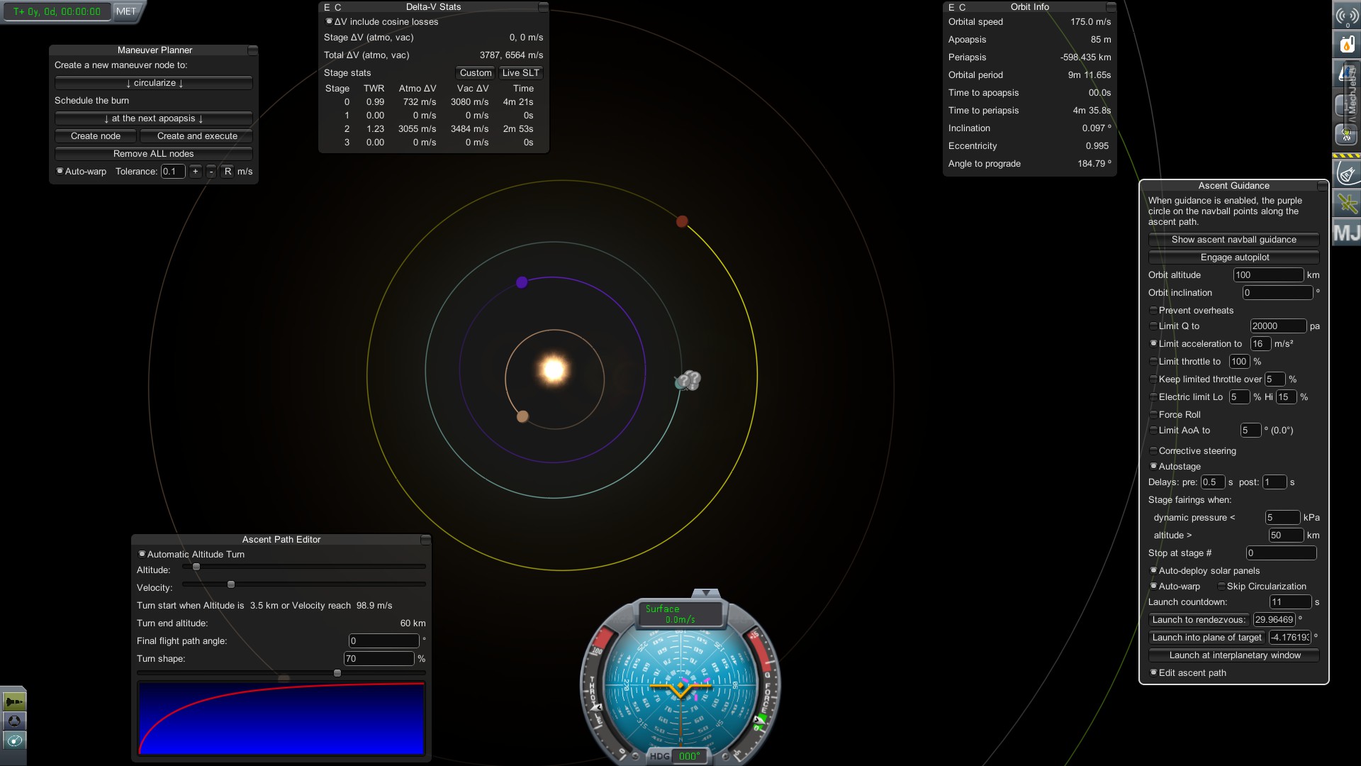 Сперва надо вернуться на орбиту Муны. Сделать это можно с помощью “Ascent Guidanсe”, но я сделаю это вручную, наберу 20 км высоты и использую “Circualize” в “Maneuver Planner”.