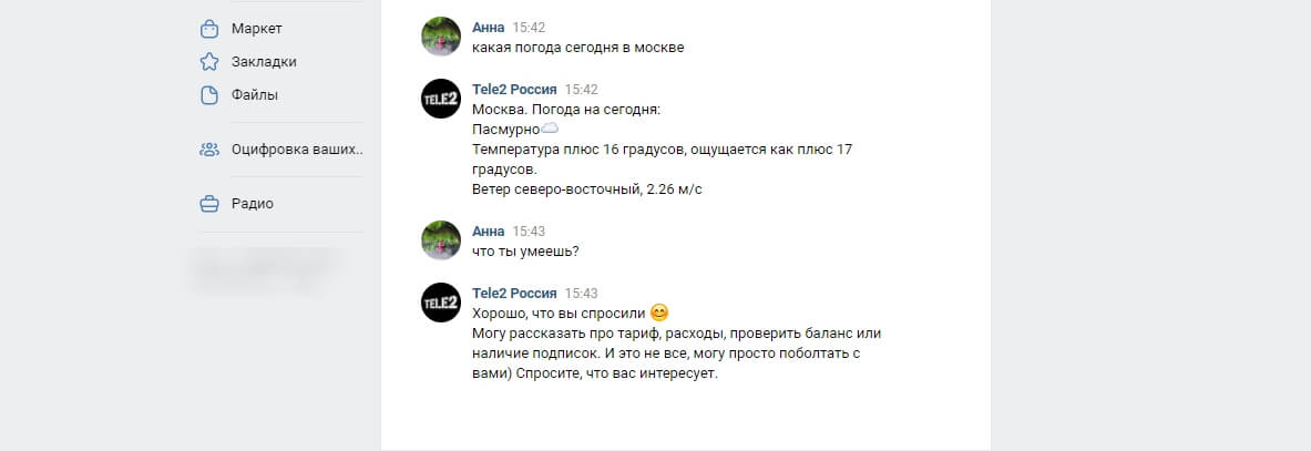 Или развлечь разговором на отвлеченные темы, как чат-бот оператора связи Теле2 во ВКонтакте.