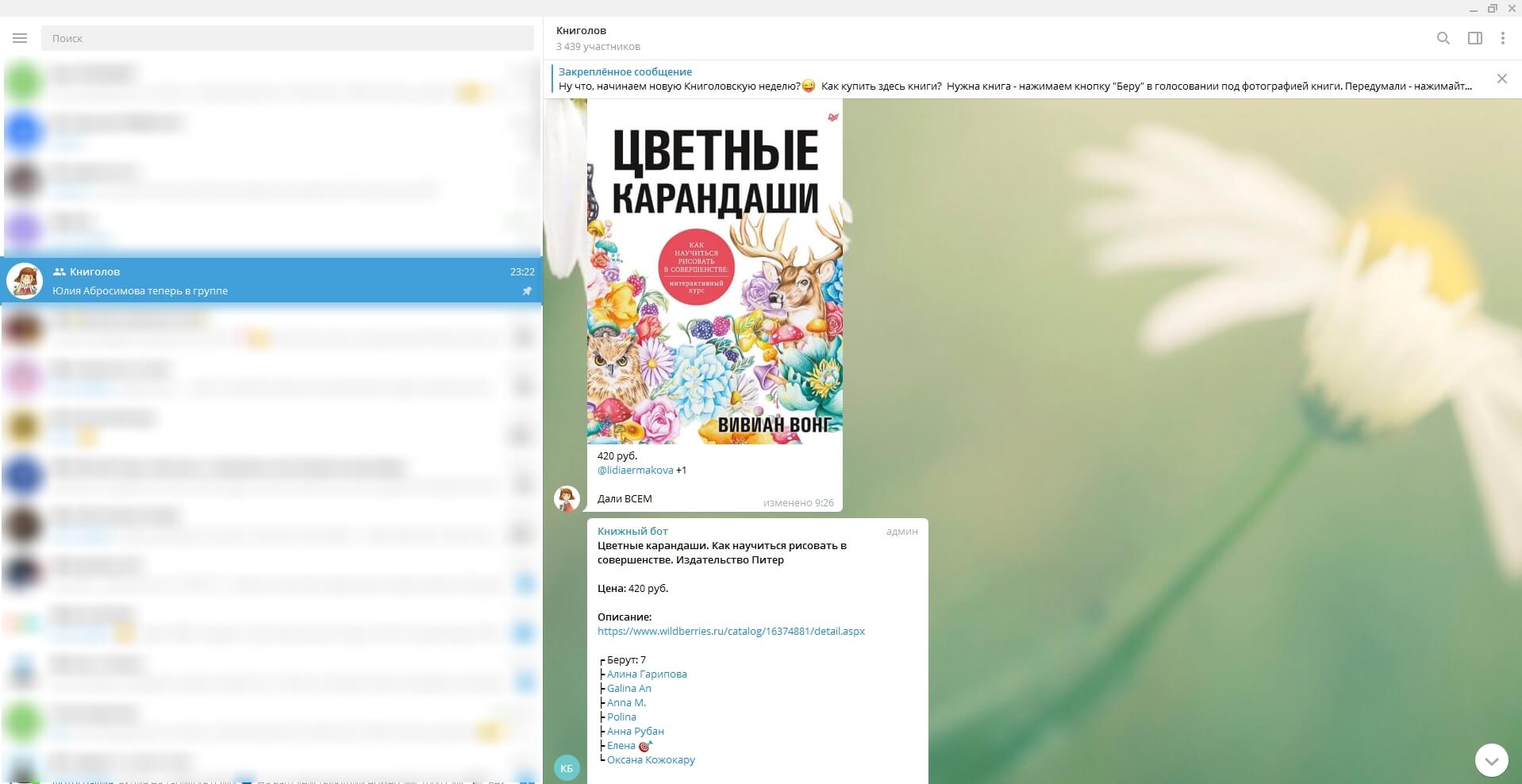 Основной чат @knigolovv, где они выкладывают книги и собирают голоса тех, кто хочет книги получить