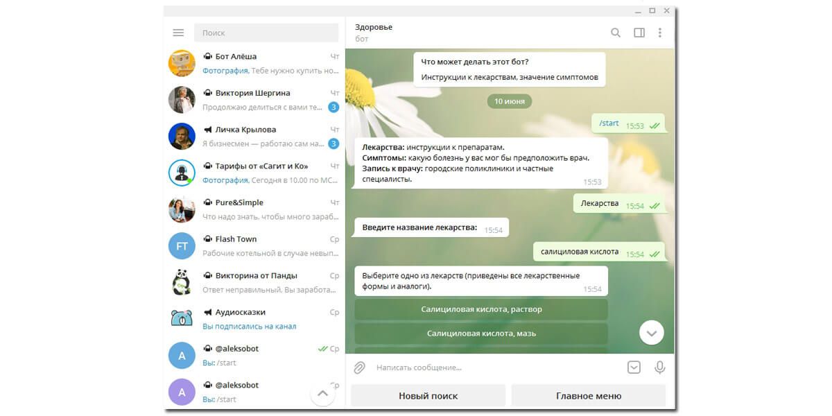 Но существуют чат-боты и для аудитории постарше. Если вы установите в Телеграм бабушки чат-бот @zdorobot от компании Mail.ru, она сможет самостоятельно узнавать значение симптомов и читать инструкции к лекарствам, не прибегая к помощи детей и внуков.