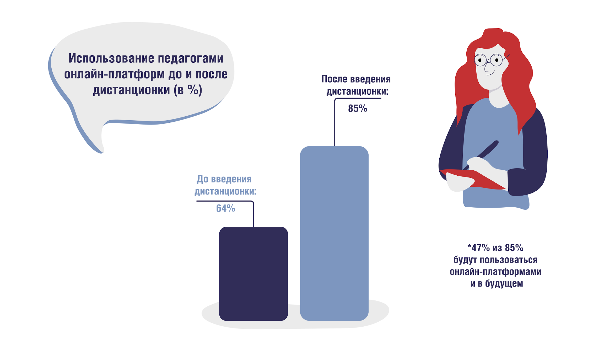 Онлайн-платформами до введения массового дистанционного обучения пользовались лишь 64% педагогов, причём делали это не регулярно. Во время школьных уроков к ним прибегали 50% учителей. После первой волны коронавируса о работе с онлайн-платформами заявили уже 85% педагогов, из них почти каждый второй сообщил, что и дальше продолжит такую практику.