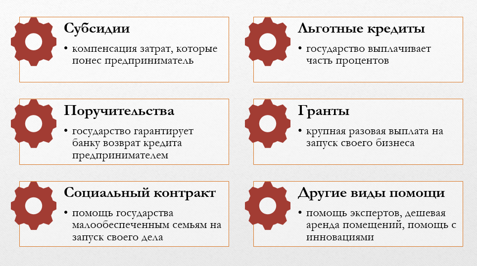 Помощь малому бизнесу от государства не ограничивается одной лишь денежной поддержкой. Кроме прямого субсидирования субъектов предпринимательской деятельности осуществляется помощь предпринимателям в различных иных формах поддержки. Государственные органы могут помочь новым ИП со льготной арендой помещений и покупкой технических средств, обеспечивают предпринимателей государственными контрактами, а также инфраструктурной, бухгалтерской, юридической поддержкой тех, кто в этом нуждается.