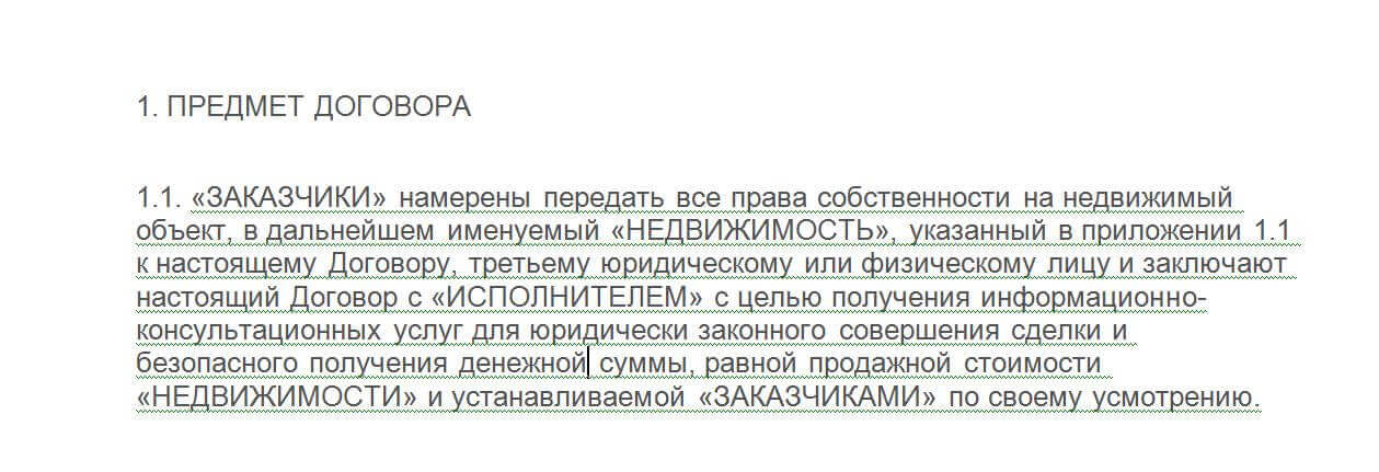 - Описание всех предоставляемых услуг по договору (продажа квартиры, поиск покупателей, сбор справок и подготовка документов для совершений сделки).