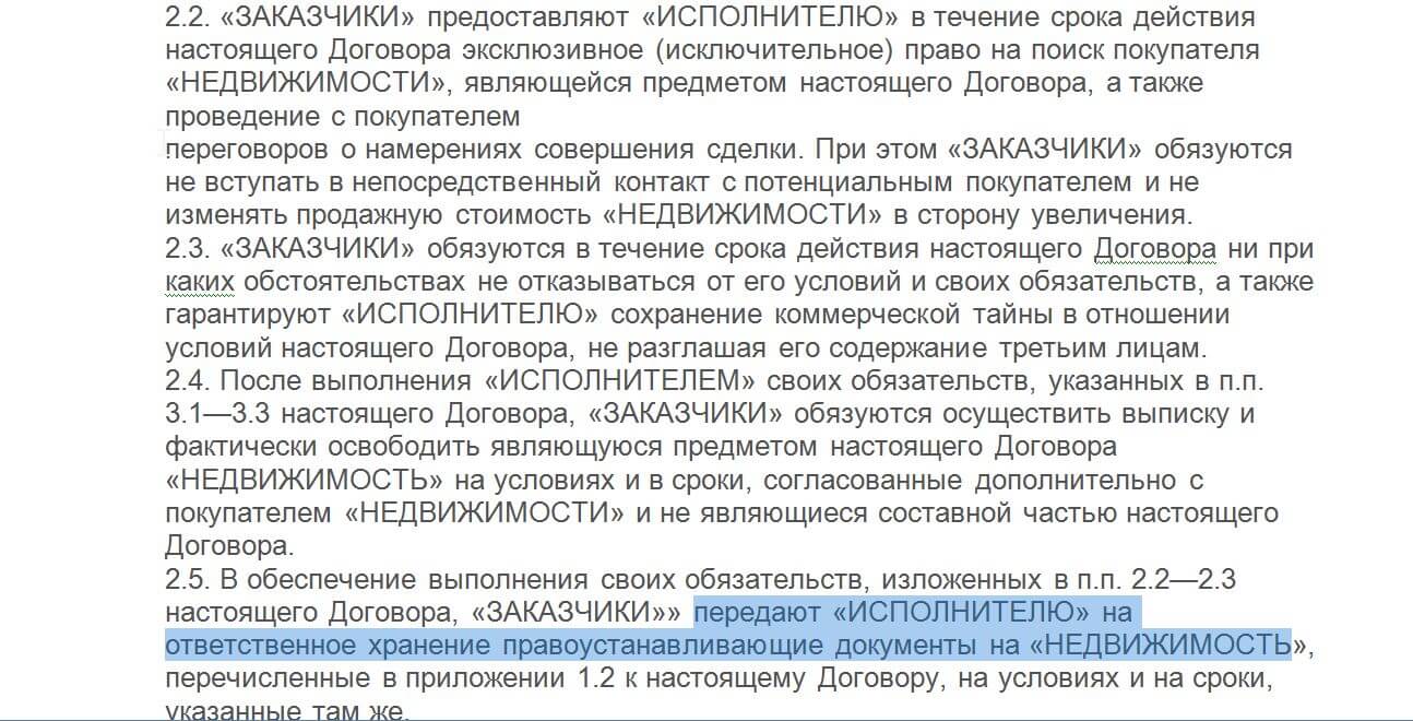 Агентство, чтобы иметь гарантию оплаты и не упустить продавца, очень часто забирает оригиналы документов на квартиру. Эксклюзивным договором они подстраховываются и окончательно привязывают вас к себе.