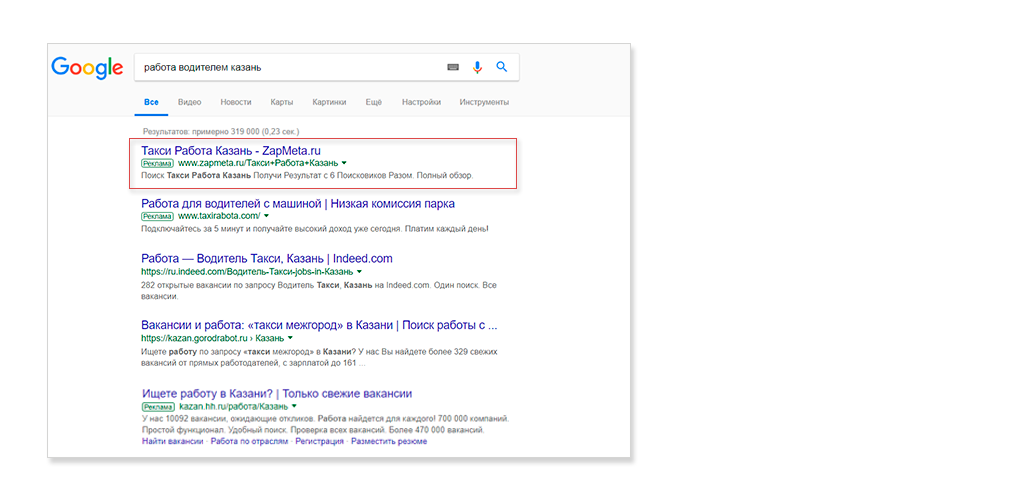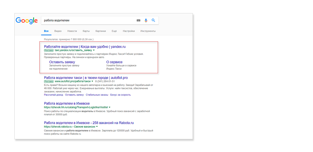Поисковик перед результатами запроса всегда сначала покажет рекламные объявления. Так потенциальный водитель при поиске работы в интернете может увидеть вакансию и вашей службы такси. Наберите сами в Google или Яндекс слова «работа водителем» или «вакансии таксиста», и вы увидите подходящую рекламу.