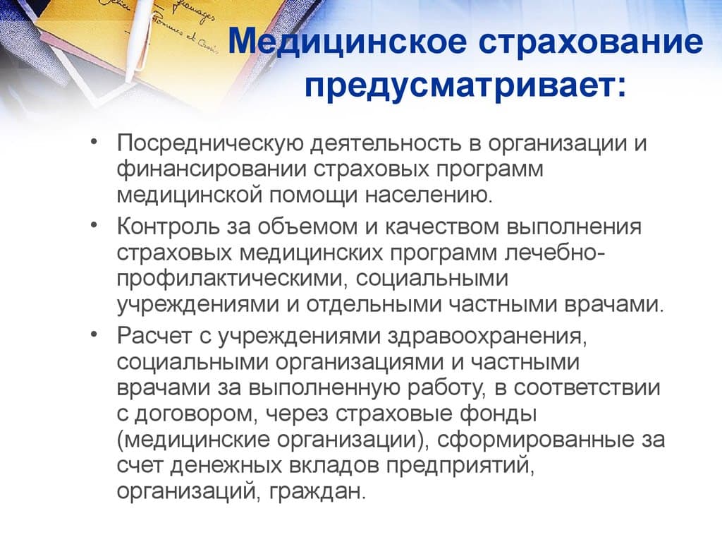 Медицинское страхование – разновидность личного медицинского обеспечения, предполагающая обслуживание в профильном учреждении за счет средств фондов, покупку лекарств, реабилитационного оборудования (или возмещение расходов за них).