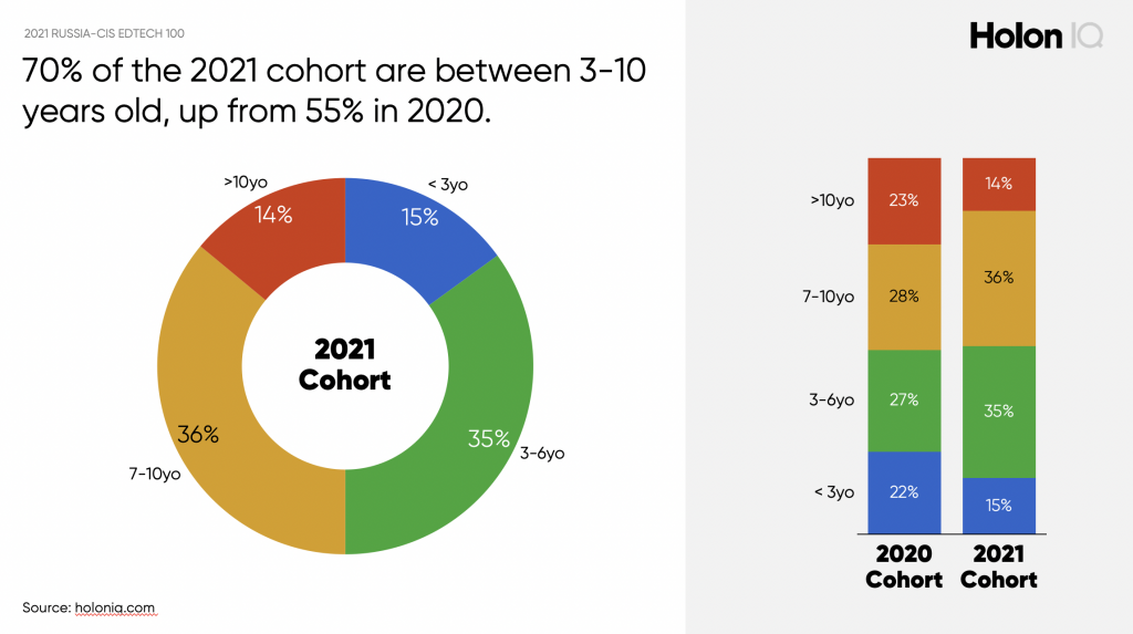 В этом году относительно молодая когорта, 50% которой сформирована менее 6 лет назад, некоторые команды начинают свое предприятие в 2020 или 2021 году, в разгар пандемии, в том числе казахстанский учебный лагерь по технологиям Qwant и онлайн-школа для детей Skysmart. Чуть более трети когорты 2021 года – это возраст от семи до десяти лет, что свидетельствует о времени, которое обычно требуется стартапам EdTech, чтобы набрать обороты.