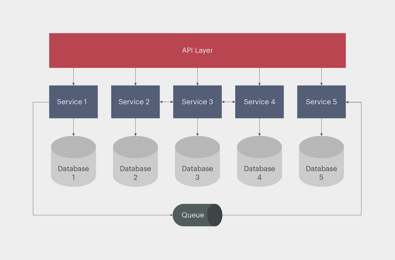 Часто в микросервисной архитектуре можно встретить API layer — это общая точка входа в систему. Она балансирует нагрузку и ограничивает доступ к сервисам, но не является обязательным компонентом.