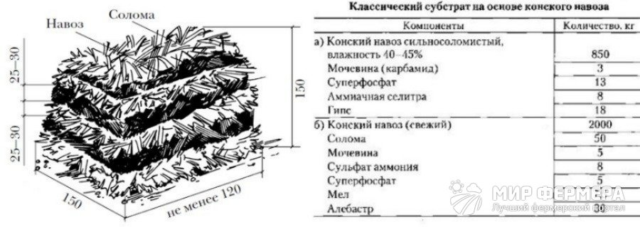 Все дело в относительной неприхотливости данного гриба. Шампиньоны еще иногда называют навозными грибами, а все потому, что их заросли при благоприятных условиях образуются рядом с соответствующими хранилищами неподалеку от коровников или конюшен. В состав субстрата для их производства, разумеется, входят и другие ингредиенты, однако, 90%-ная доля в весе приходится именно на навоз. Другими словами, основа для грибной фермы – субстрат на основе навоза – является весьма распространенным и потенциально недорогим фактором производства. Однако справедливо было бы перечислить все ингредиенты и пропорции их внесения (по весу):