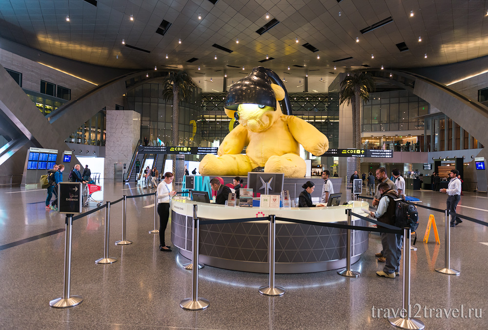 Это место центр аэропорта Хамад, узнать его просто в середине огромного зала сидит огромный медведь с лампой на голове. Рядом с ним расположен справочный стол, где можно узнать необходимую информацию.